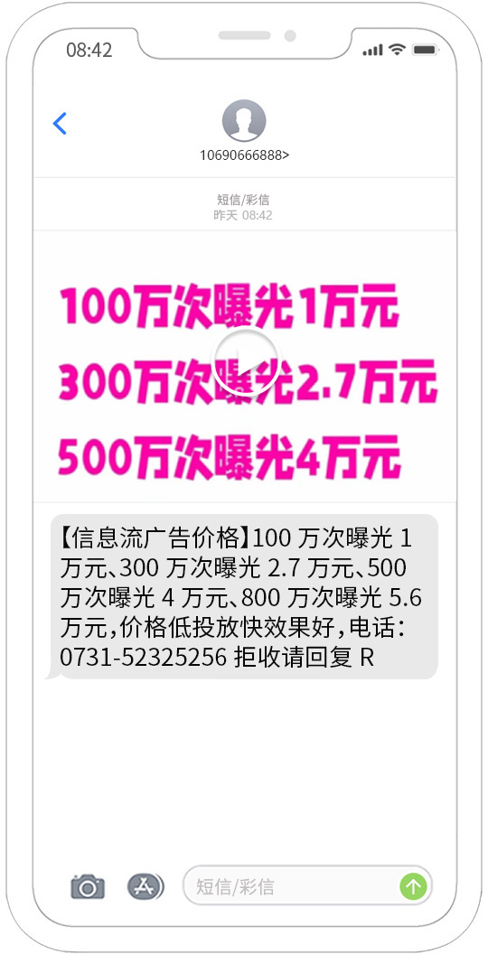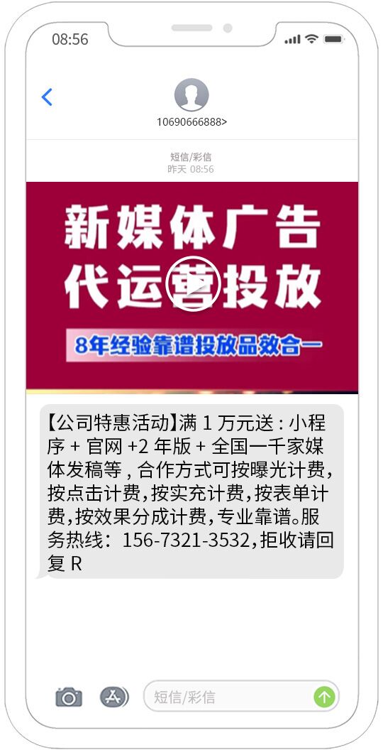 視頻短信發(fā)送能夠覆蓋移動、聯(lián)通、電信用戶,正規(guī)集團視頻短信通道,快速、可靠、穩(wěn)定、形象好,能快速將您的訊息投放到用戶的手機。